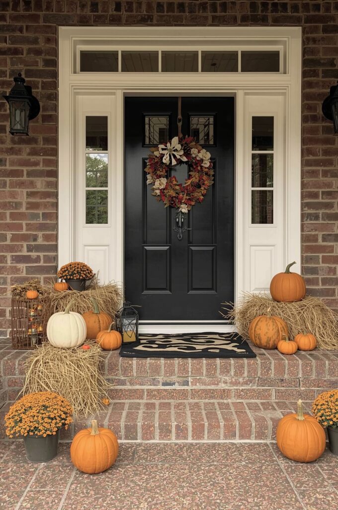 Mix pumpkins, hay bales, and lanterns with subtle spooky accents for a cozy yet seasonal porch design.