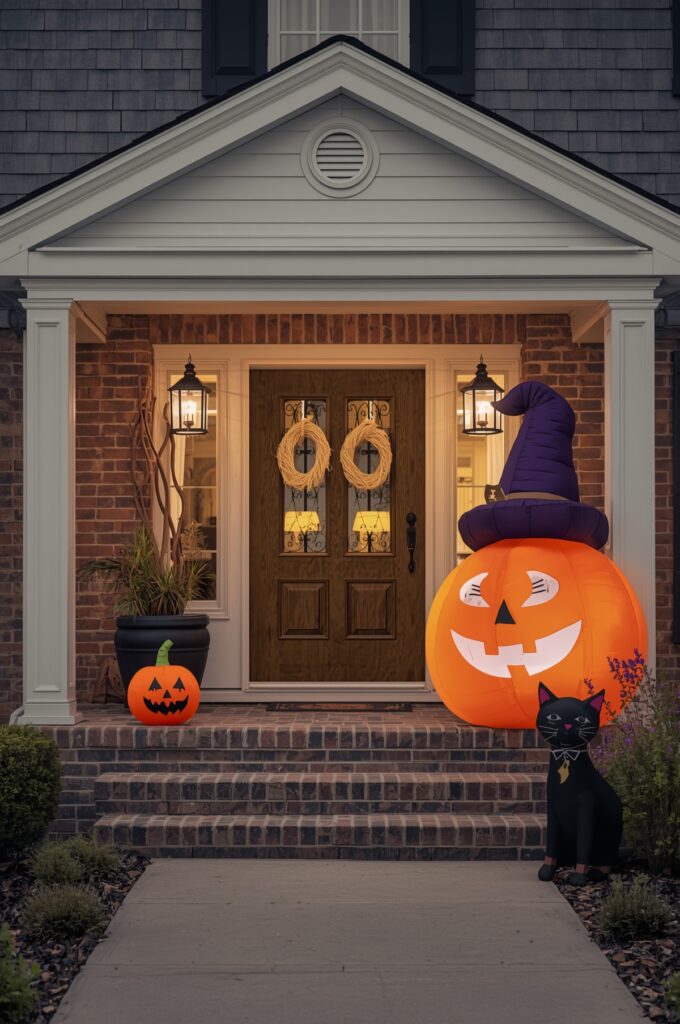 For bold, family-friendly décor, go with giant inflatable pumpkins, witches, or black cats. They’re playful and make a big impression.