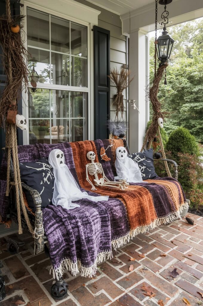 If you have a swing or bench, decorate it with throw blankets, skeletons, or ghostly dolls for a chilling seating vignette.
