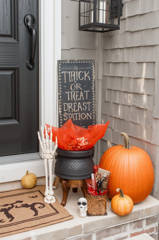 Create a themed candy station with a decorated cauldron, skeleton hand candy scoop, and fun signage. Perfect if you expect lots of kids.