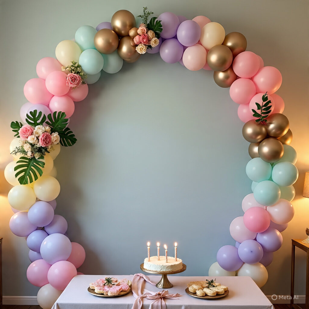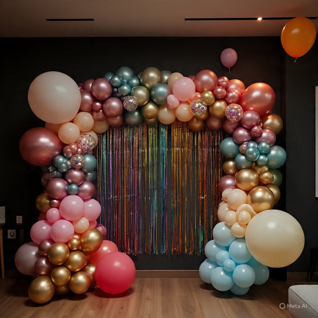 Balloons are the go-to choice for birthday decorations. Create a balloon wall by sticking balloons in different colors and sizes to your main party wall. For a dramatic effect, mix metallic, pastel, and confetti balloons.
