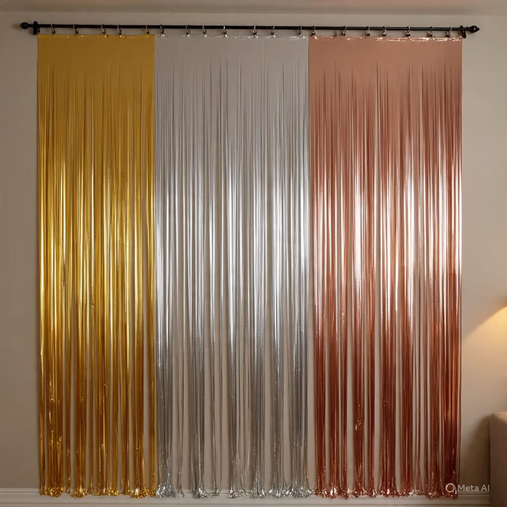 Foil streamer curtains in metallic shades like gold, silver, or rose gold create a glamorous wall look. They also make a perfect backdrop for pictures.