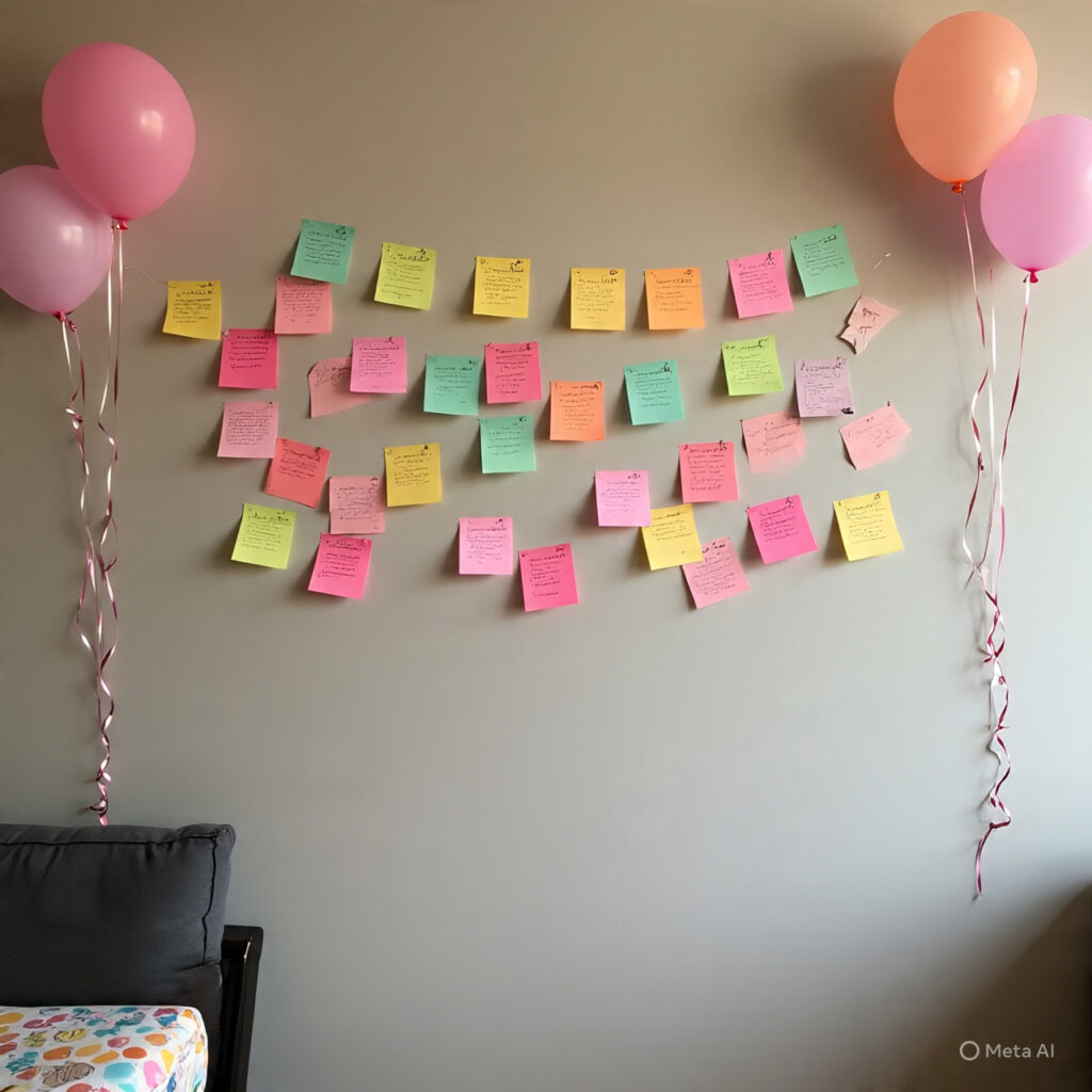 Stick colorful sticky notes or cards where guests can write birthday wishes. By the end of the night, the wall becomes a heartfelt memory board.