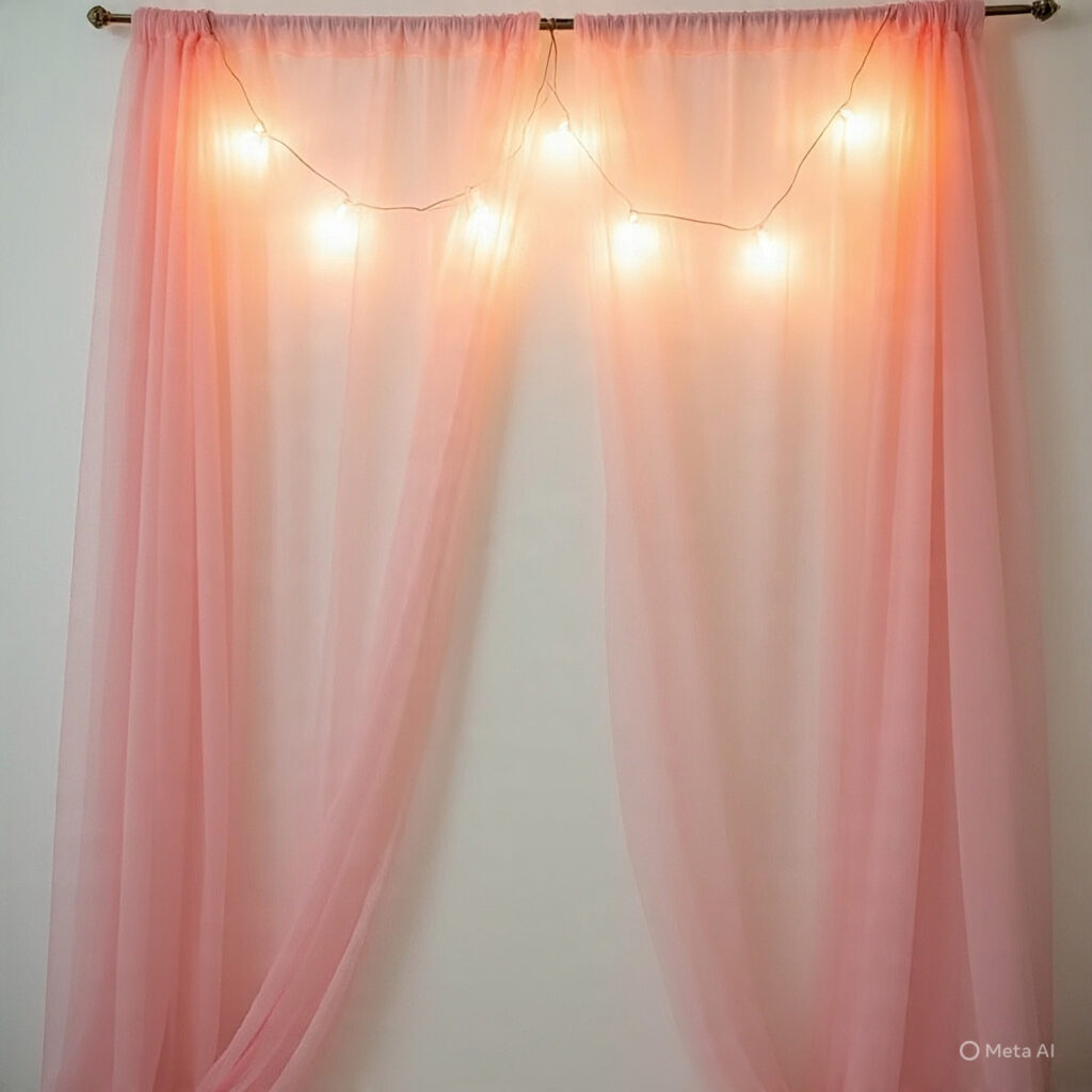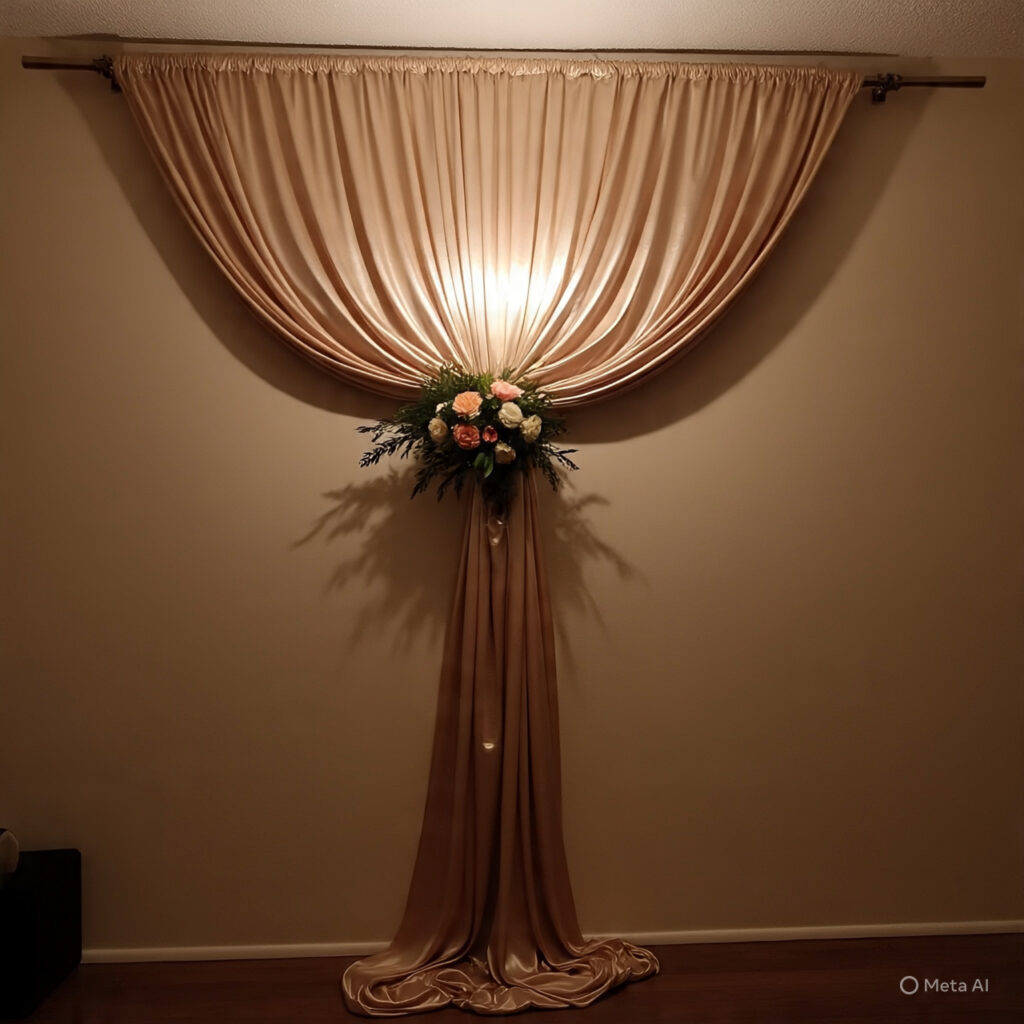 Use sheer curtains in white, gold, or pastel shades to create an elegant wall backdrop. Add fairy lights behind them for a soft, glowing effect.