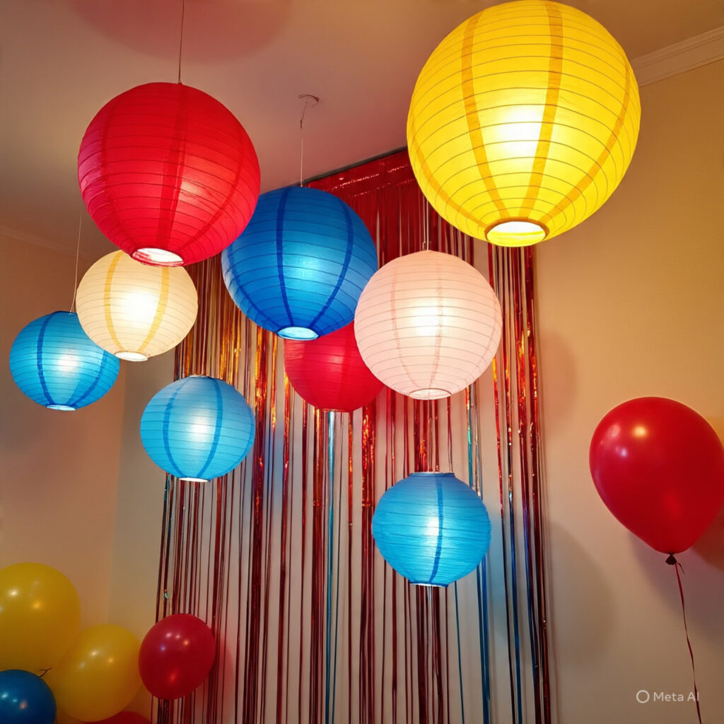 Hang paper lanterns from the ceiling and extend them toward the wall. Choose colors that match your party theme for a coordinated look.
