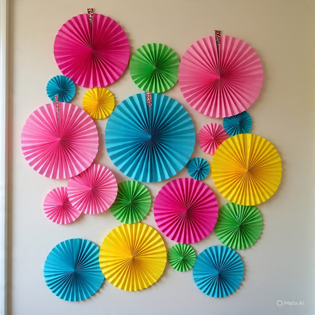 Paper fans and rosettes are affordable and come in various colors. Arrange them on the wall in a mix of big and small sizes for a layered effect. They bring instant cheer and depth to your décor.