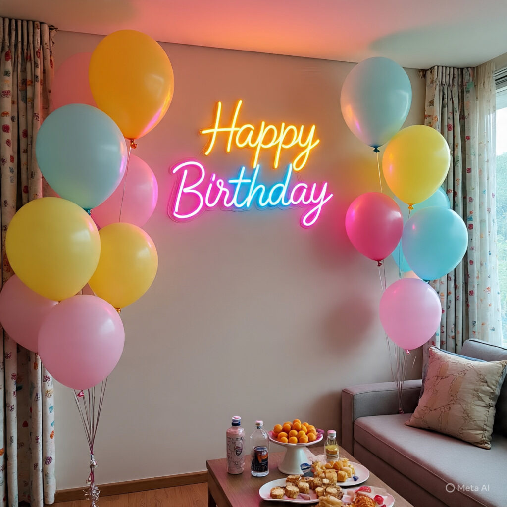 Rent or buy a neon sign with words like “Happy Birthday,” “Cheers,” or “Party Time.” Pair it with balloons or curtains for a trendy backdrop.