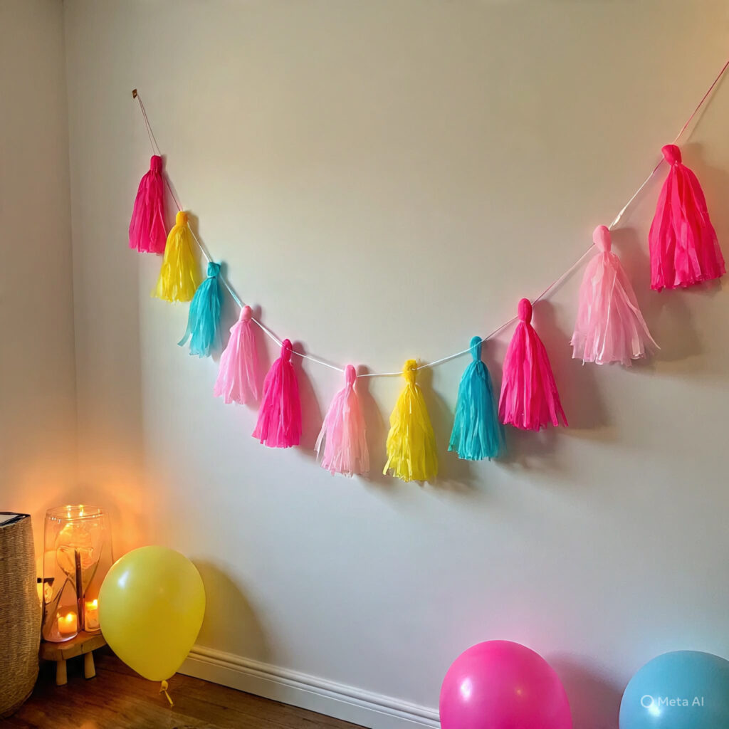 DIY tassel garlands from tissue paper or fabric and hang them across the wall. Use metallic shades for a glamorous touch.