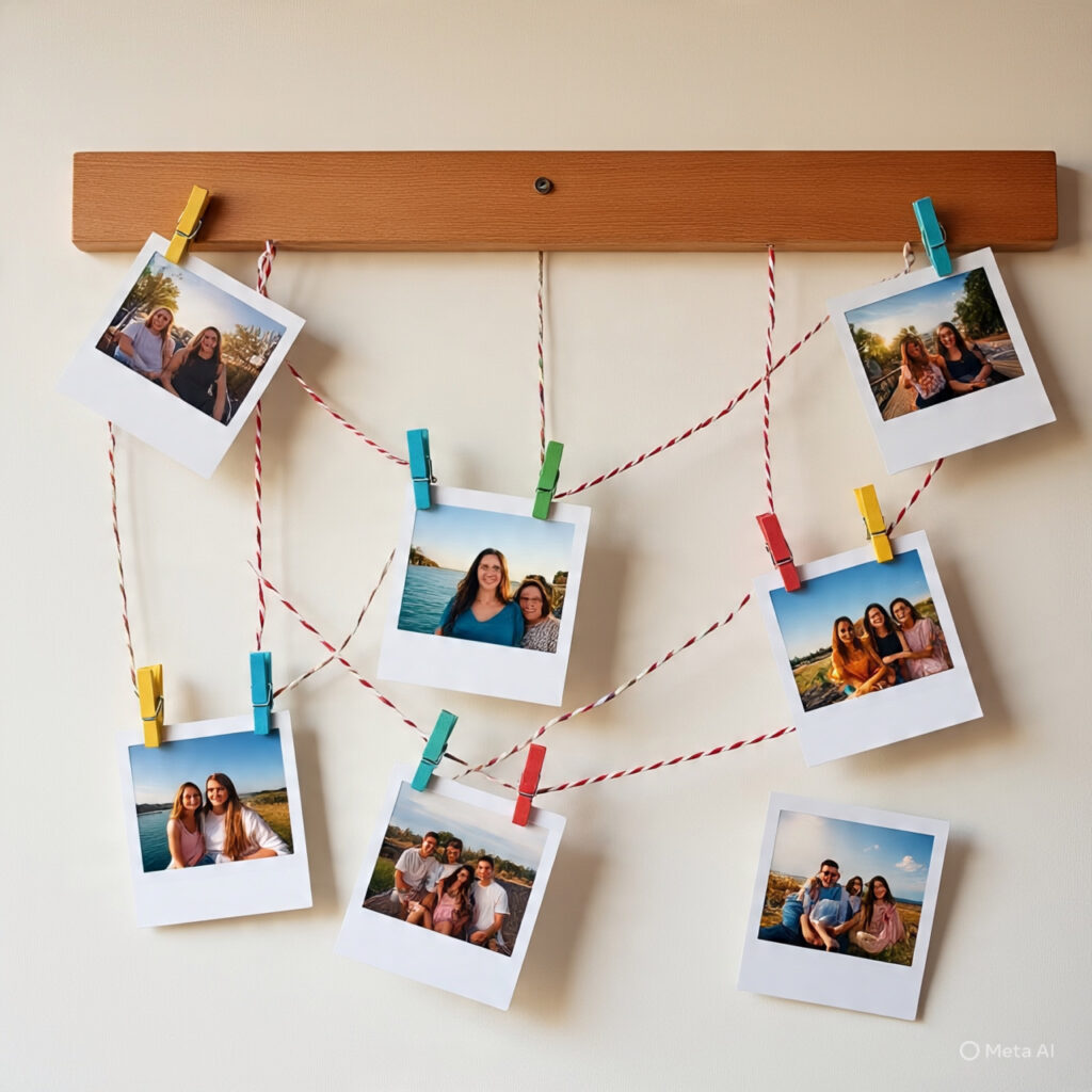 Print Polaroid-style pictures and hang them on strings with clothespins. This doubles as a decorative wall and a walk down memory lane.