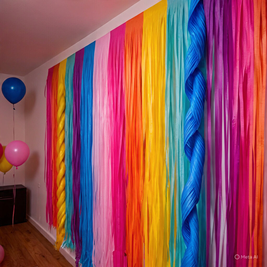 Streamers are classic party decorations. Hang colorful paper streamers vertically to cover your wall. For a trendy twist, twist or braid them for a textured look.