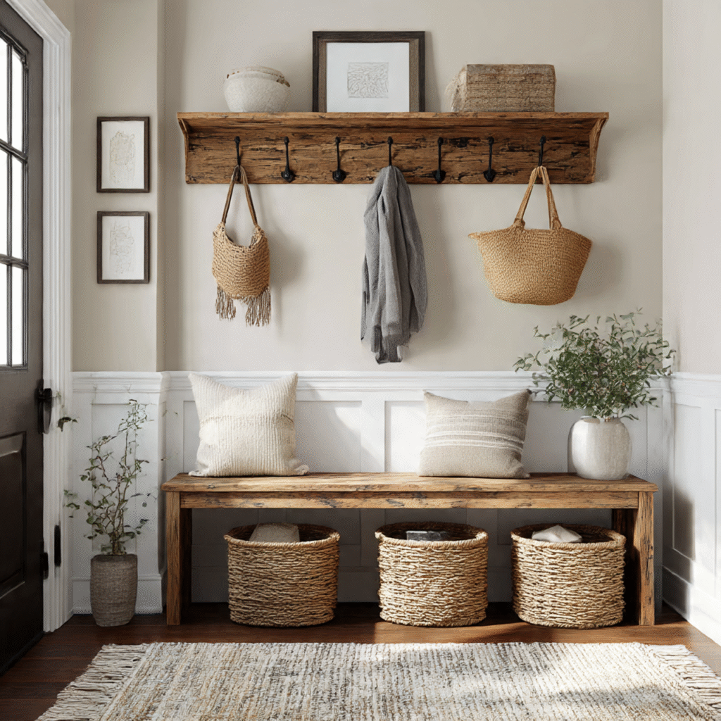 Add functionality and charm by building or upcycling a simple wooden bench with storage baskets.