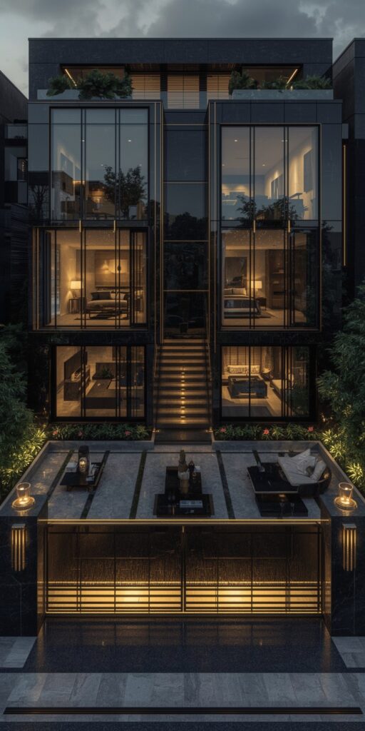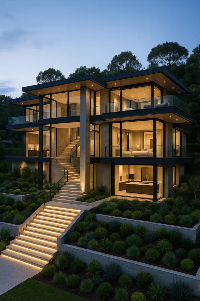 In 2025, luxury exteriors are getting smarter. Integrated lighting systems now respond to time of day, mood settings, or even weather changes. Hidden strip lights and programmable façade uplights make homes glow elegantly after dark, like living pieces of art.