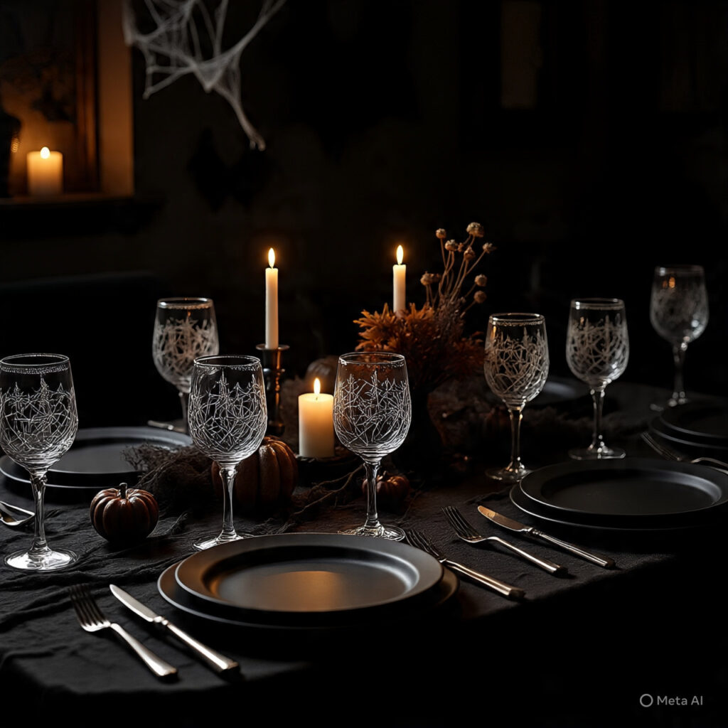 Set your table with matte black plates, silver cutlery, and wine glasses etched with gothic patterns.