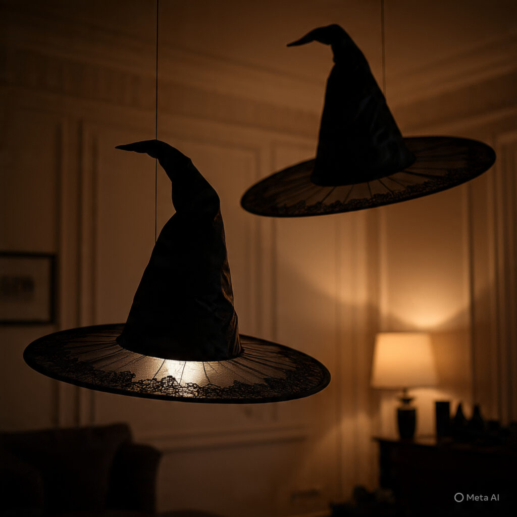 Hang witch hats from the ceiling with invisible string for a whimsical yet stylish effect.