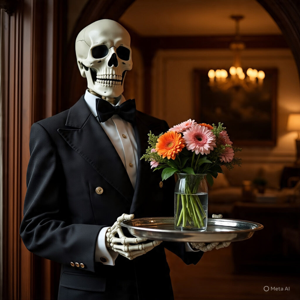 Position a life-sized skeleton holding a silver tray near the entrance. Add a bowtie for elegance.