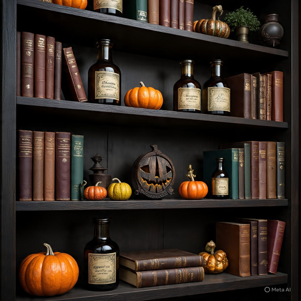 Add faux potion bottles, antique books, and small pumpkins to your bookshelf styling.