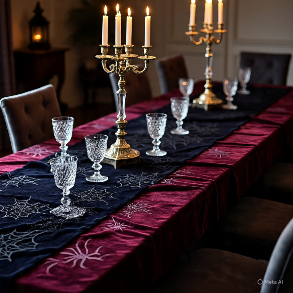 Use deep velvet table runners in shades of burgundy, navy, or black for your dining table. Add crystal glassware for a luxe touch.