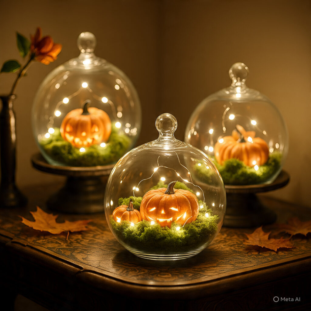 Fill glass cloches with mini pumpkins, moss, and fairy lights for a chic seasonal display.