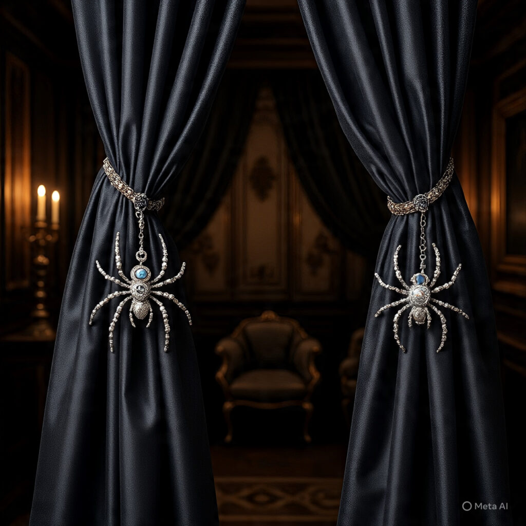 Use jeweled spider brooches or metallic pins as curtain tiebacks.