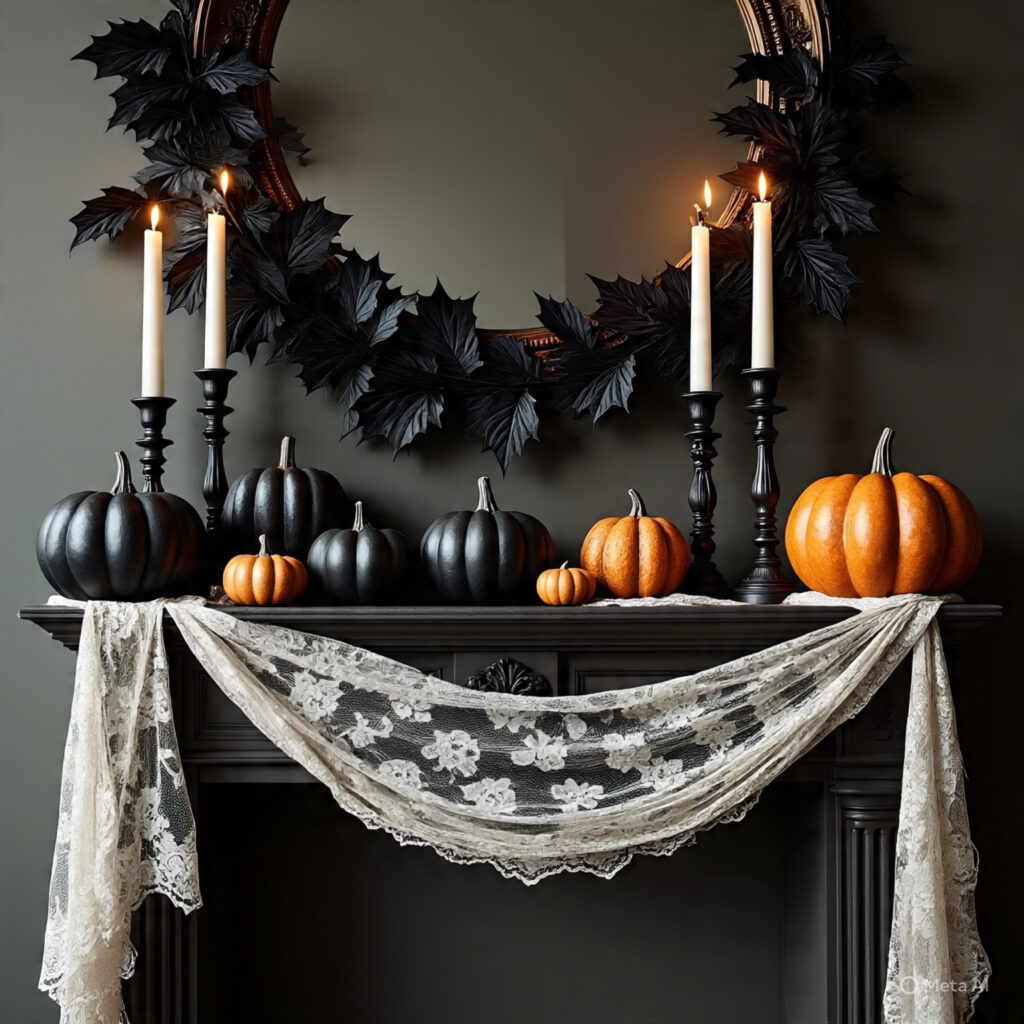 Style your mantel with layered mirrors, candlesticks, pumpkins, and draped lace. Add a garland of faux black leaves for drama.