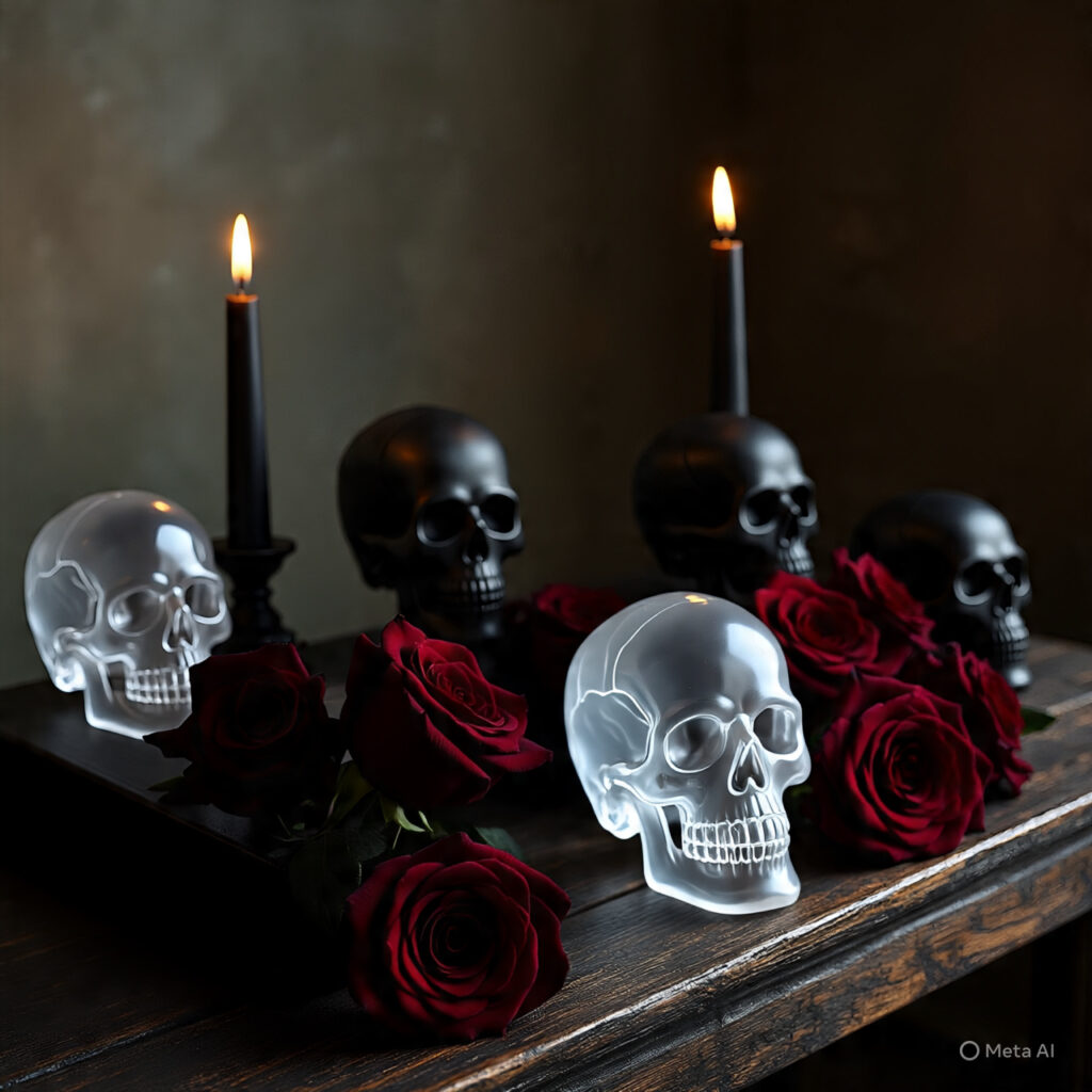 Use crystal or matte black skulls as table décor. Pair with roses for a dramatic gothic look.