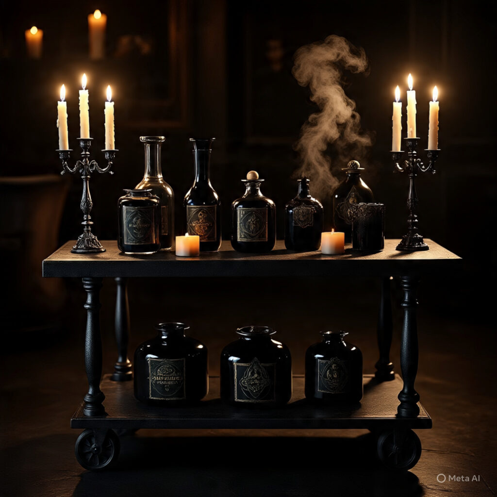 Style your bar cart with black glassware, decanters, and spooky cocktail labels. Add some dry ice for misty vibes.