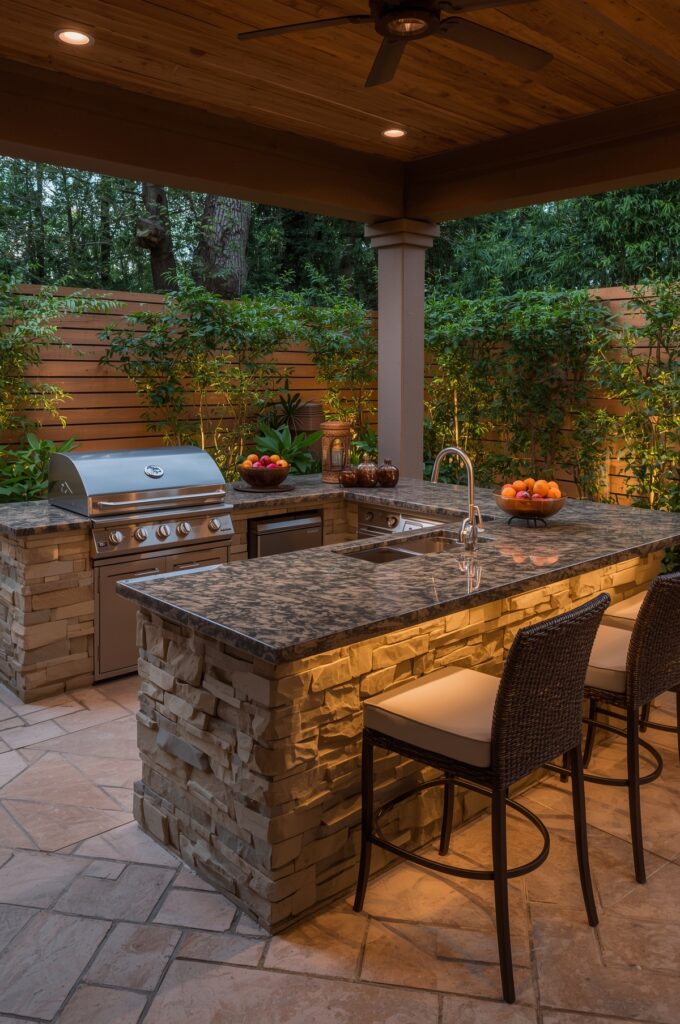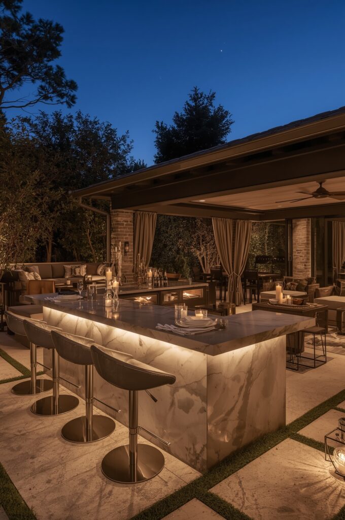 A well-designed bar setup with marble counters, barstools, and mood lighting makes your patio party-ready.