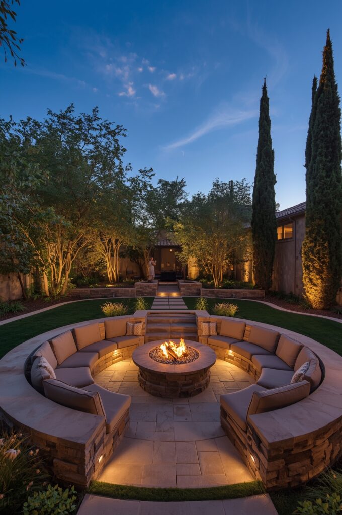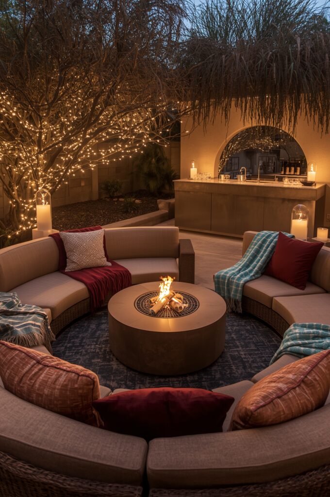 A central firepit surrounded by circular sofas creates a cozy social hub for evenings outdoors.