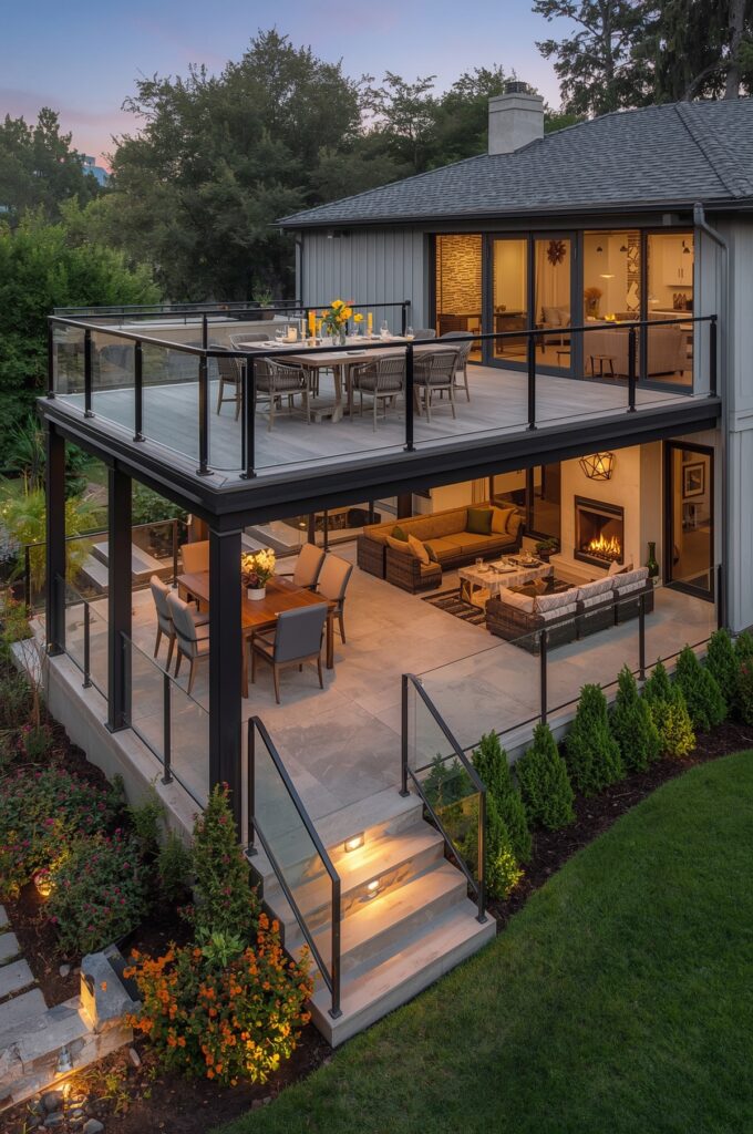 Split your backyard patio into levels—one for dining, another for lounging. Add glass railings for a chic finish.