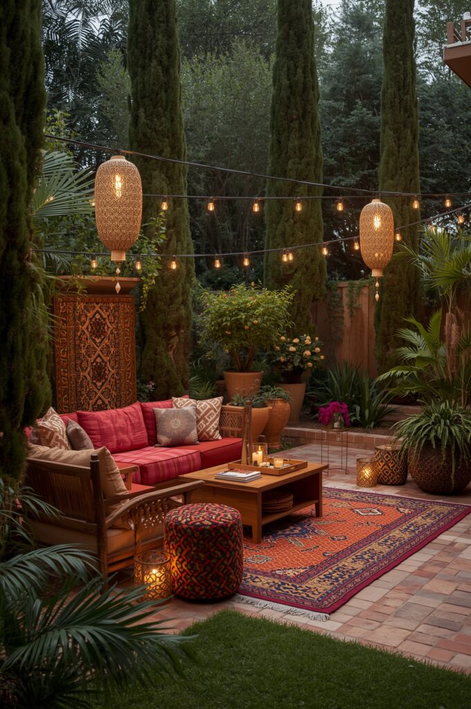 Rich fabrics, lanterns, and bold colors give your patio an exotic, luxurious charm. Low seating and patterned rugs add extra coziness.