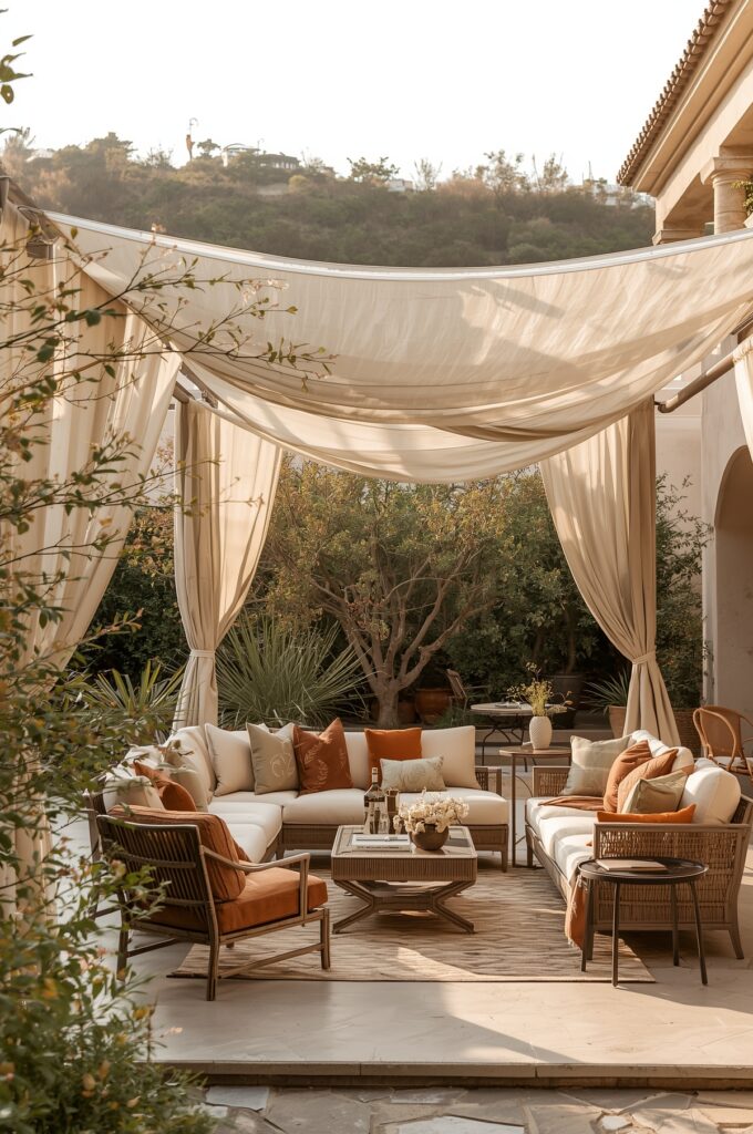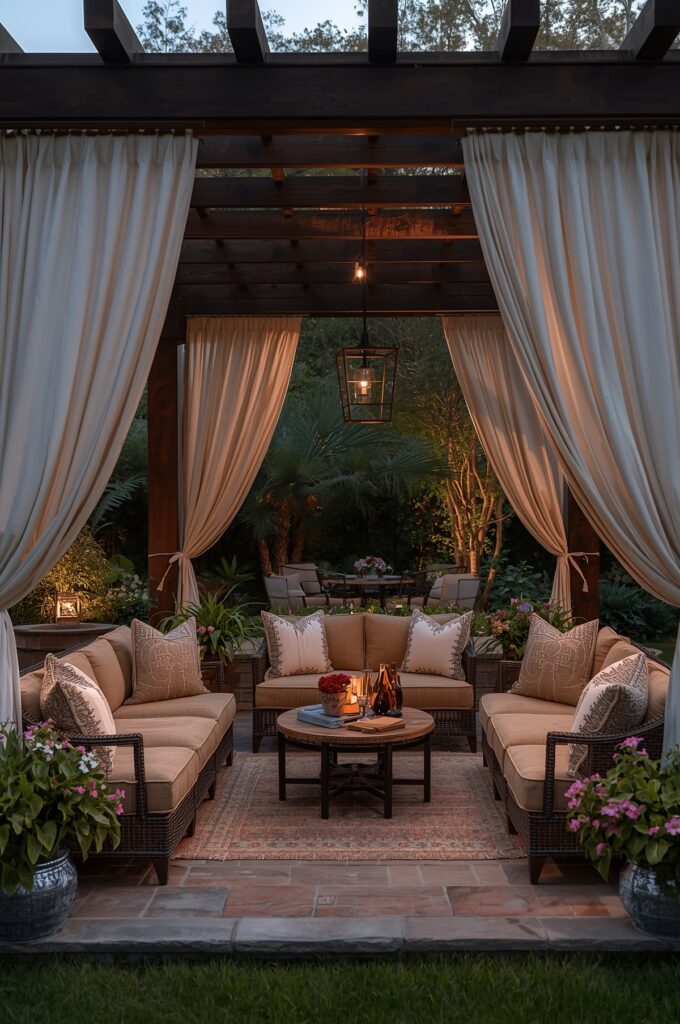 A pergola offers structure, while soft flowing drapes add elegance and intimacy. Pair it with plush seating for a romantic feel.
