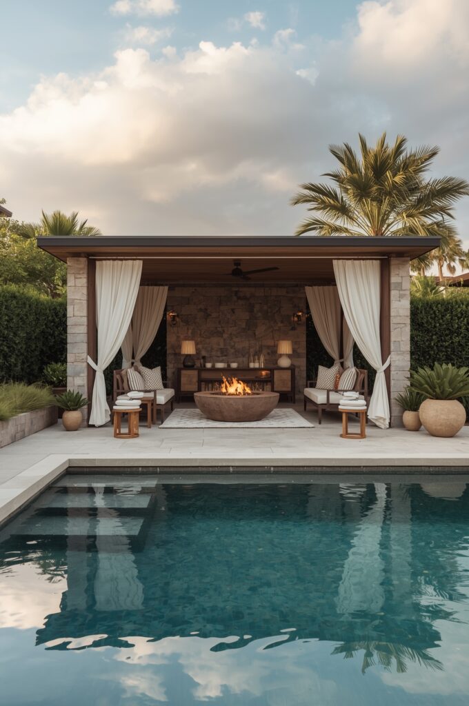 Cabanas with flowing curtains and plush lounges give your backyard the luxury of a high-end resort.