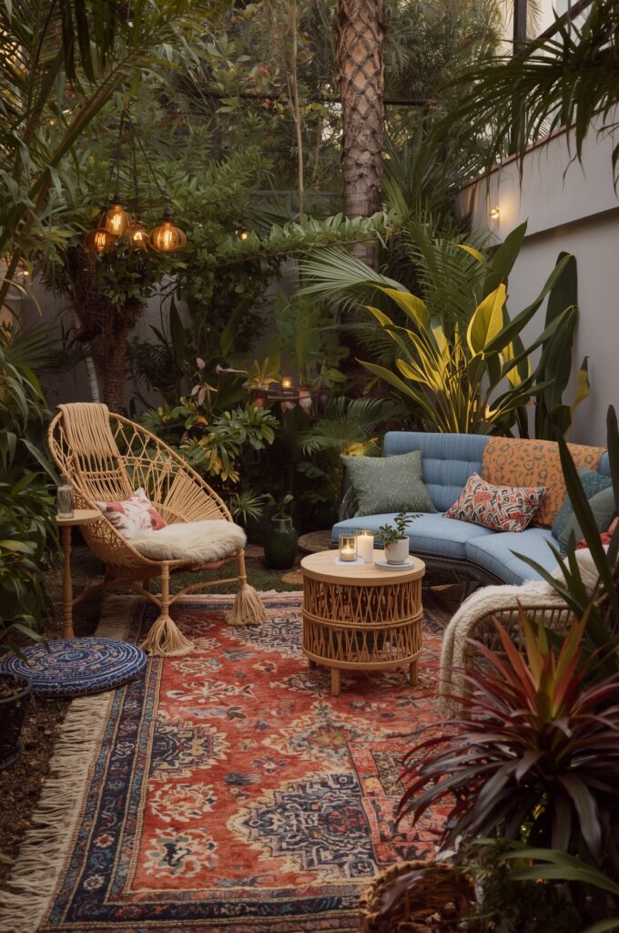 Macrame chairs, patterned rugs, and eclectic furniture combine for a cozy, artistic backyard retreat.