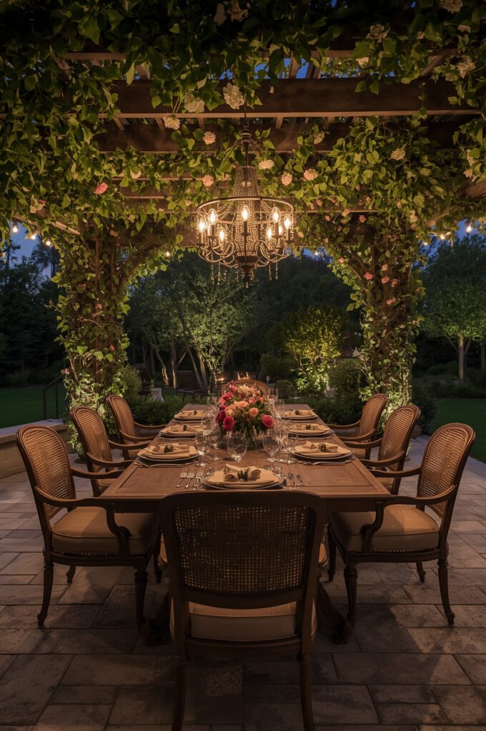 A large dining table under a canopy or pergola is perfect for entertaining. Add chandeliers or string lights for a cozy dinner atmosphere.