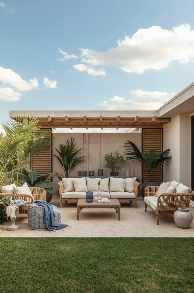 Soft blues, sandy tones, and natural wood create a beach-inspired patio layout.