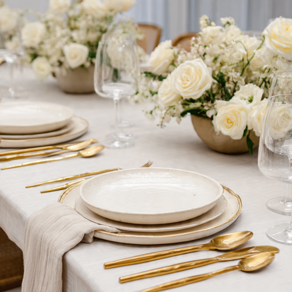 Set your dining table with cream tablecloths, gold cutlery, and neutral napkins. Add white candles and mini pinecones for a touch of festivity.