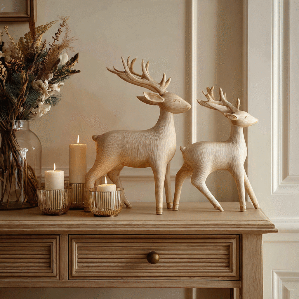 Incorporate wooden reindeer, trays, or rustic candle holders to balance out soft neutrals with natural warmth.