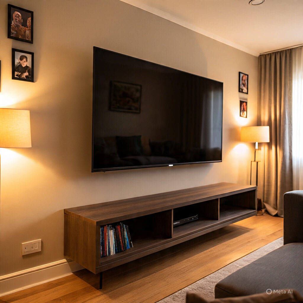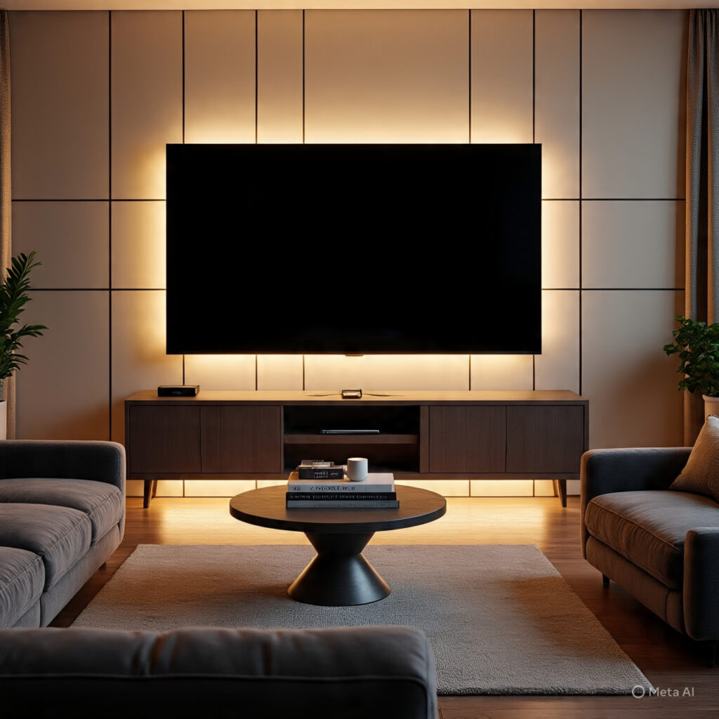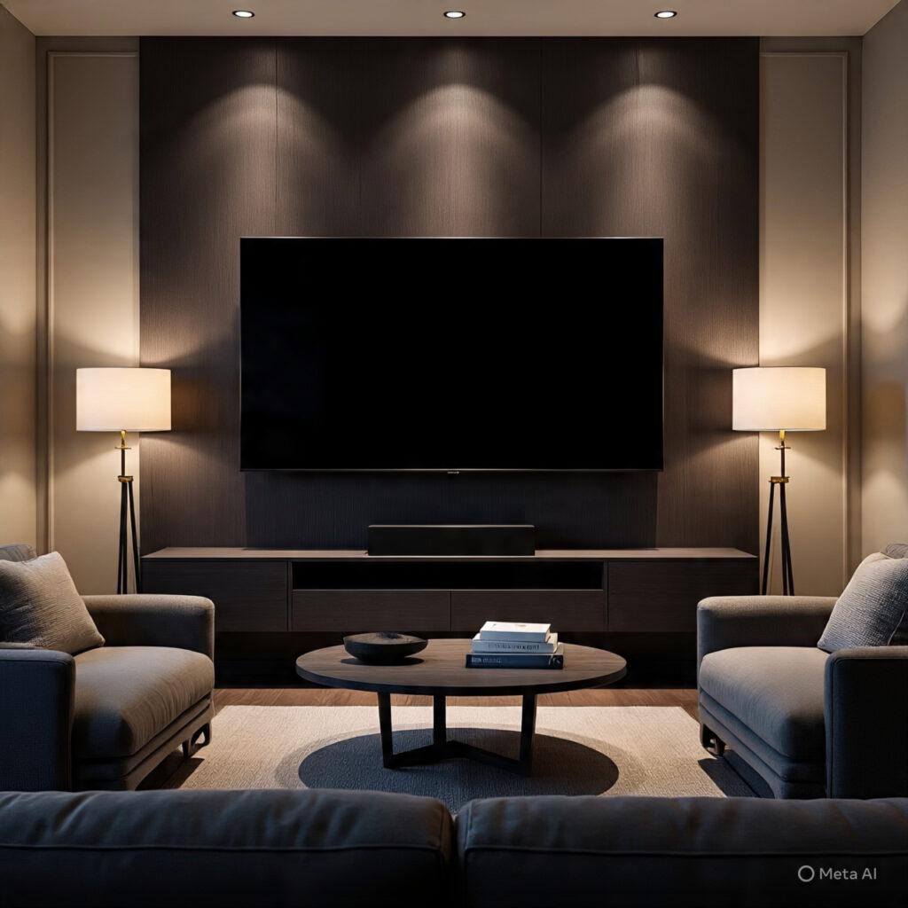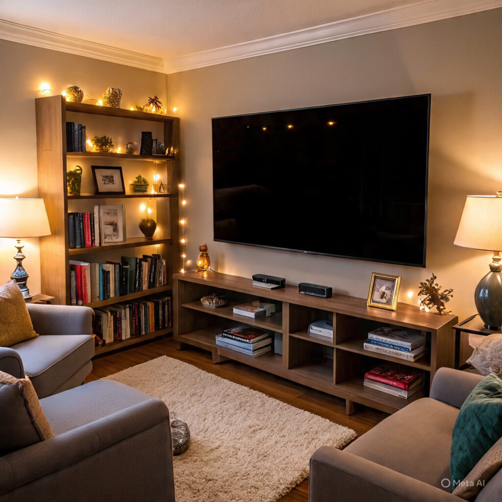 If you don’t have space for a central media wall, transform a corner into your entertainment spot with shelves and soft lighting.