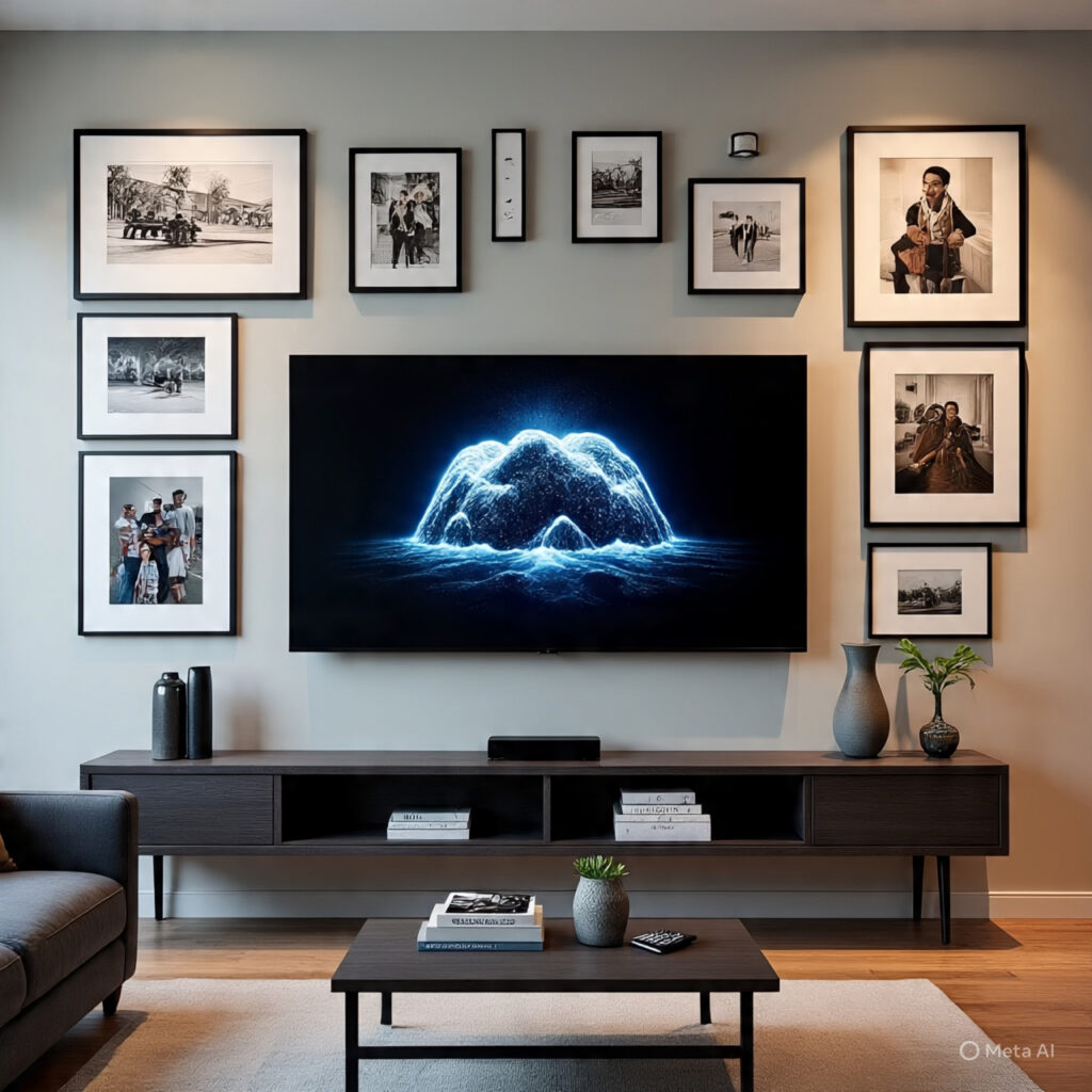 Mix artwork, framed photos, and your screen into one cohesive gallery wall. This balances tech and creativity beautifully.