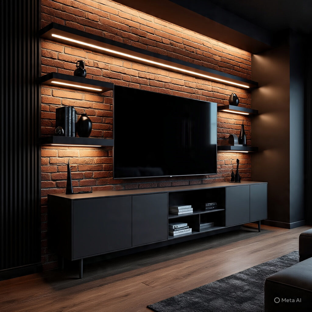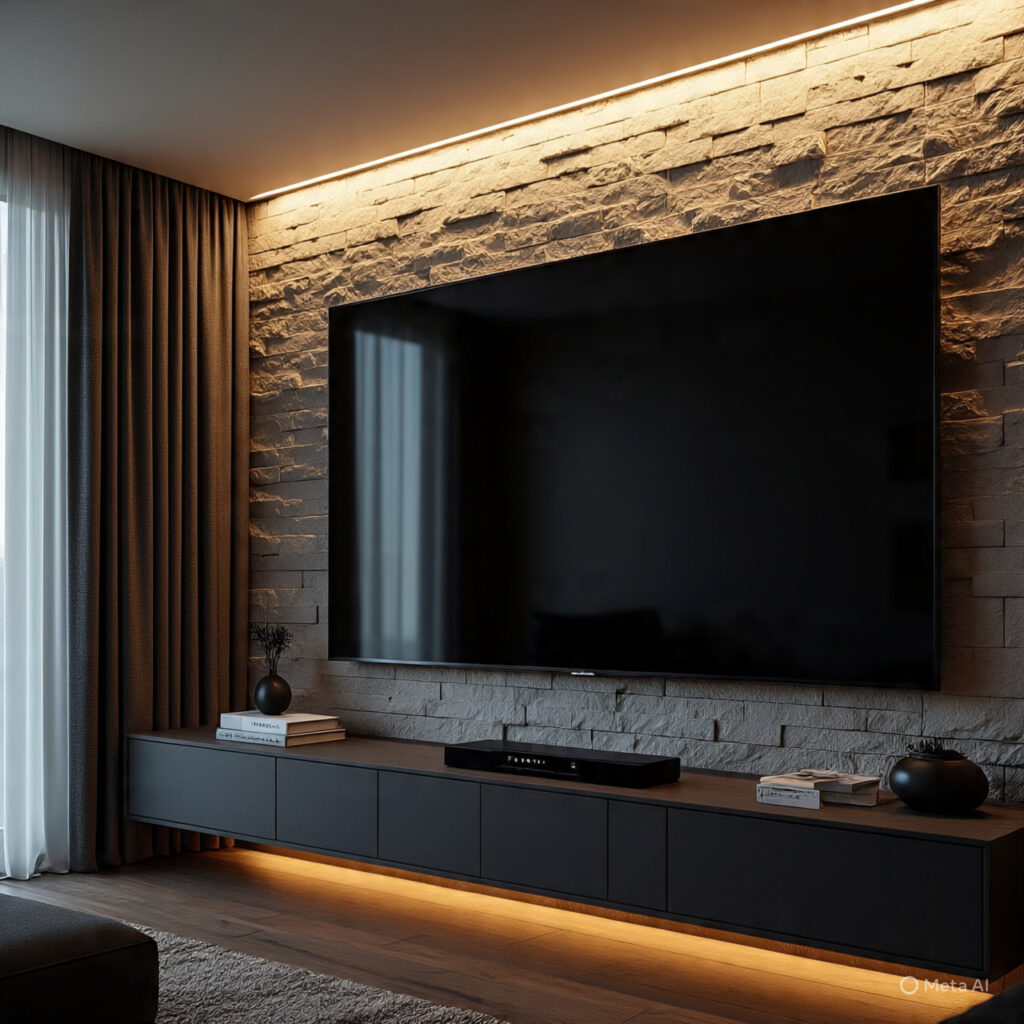 Use materials like stone cladding, tiles, or textured wallpaper to make your TV wall the center of attention.