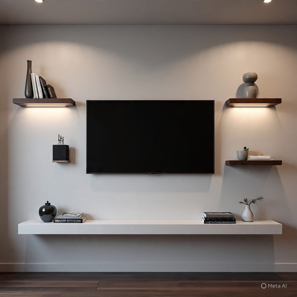 If you have a small space, go for a floating cabinet under your TV. It provides storage while keeping the wall sleek and uncluttered.