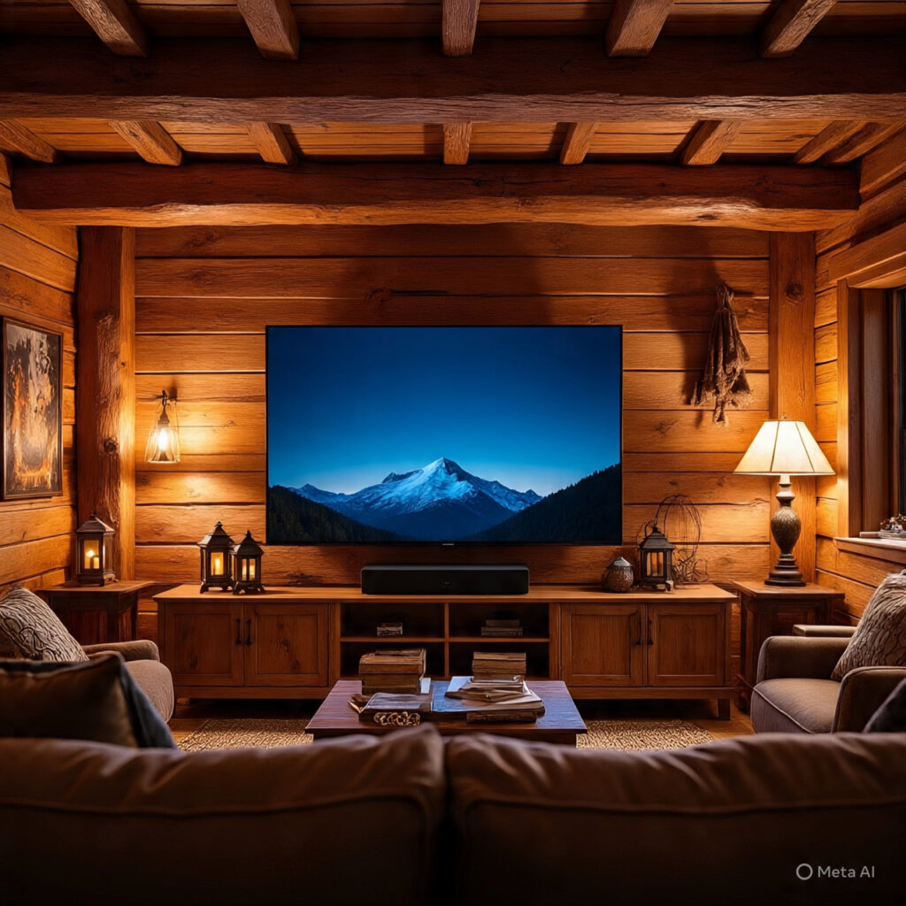 If you’re going for a cozy cabin vibe, add wood paneling around your TV wall. A rustic design makes your family movie nights feel warm and inviting.