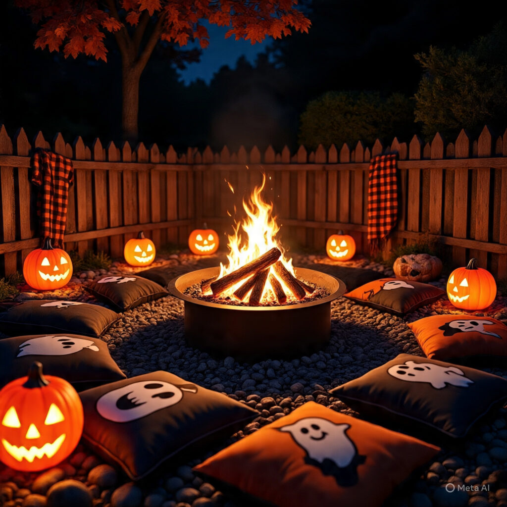 Round off your Halloween garden with a fire pit area. Decorate with Halloween cushions, plaid throws, and pumpkin lanterns. Perfect for ghost stories at night!
