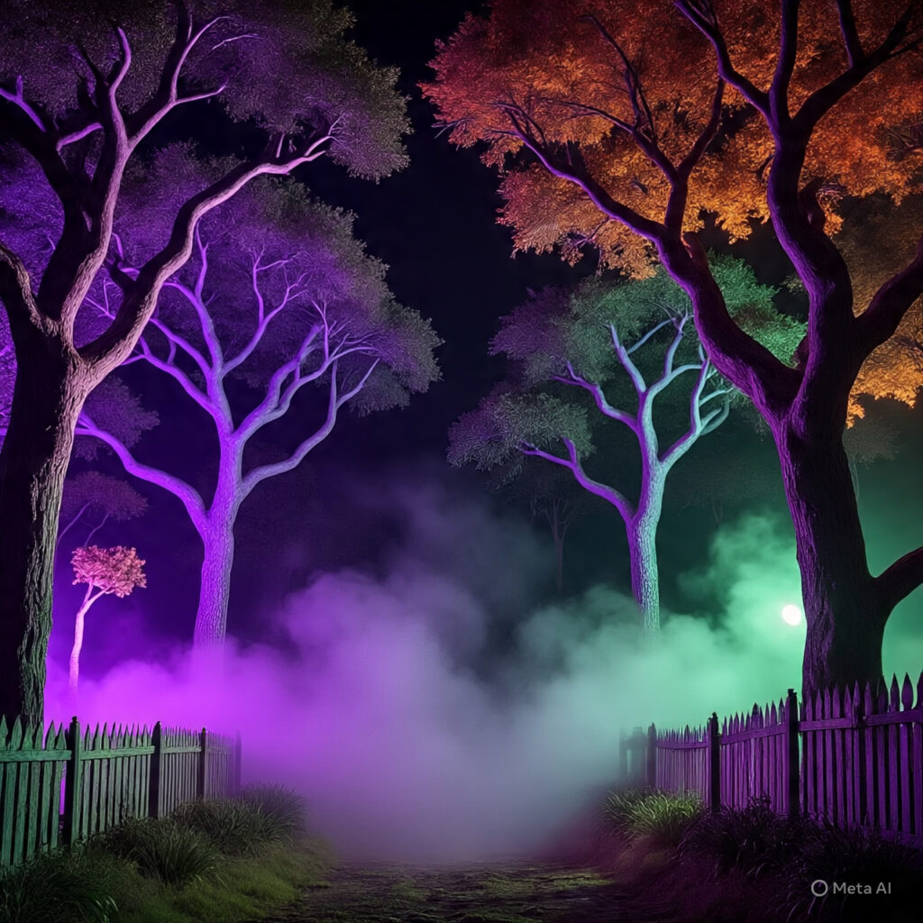 Replace warm garden lights with purple, green, and orange LED spotlights. Highlight trees, fences, and even fog for a spooky glow.