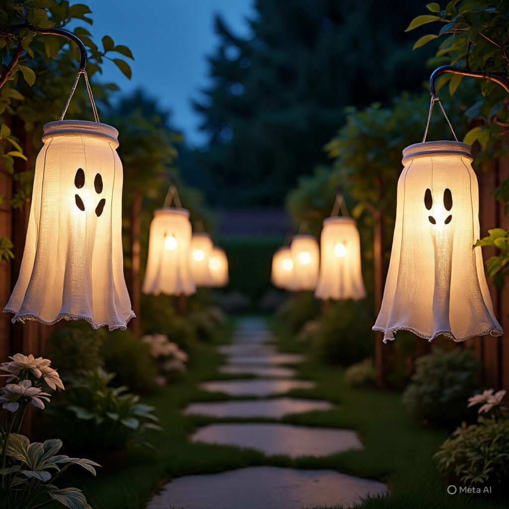 Line your pathways with lanterns designed as floating ghosts. You can create these using mason jars, cheesecloth, and LED candles for a budget-friendly DIY idea.
