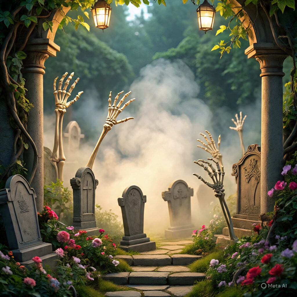 Set up a mini graveyard using tombstone props, fog machines, and skeletal hands emerging from the soil for that chilling effect.