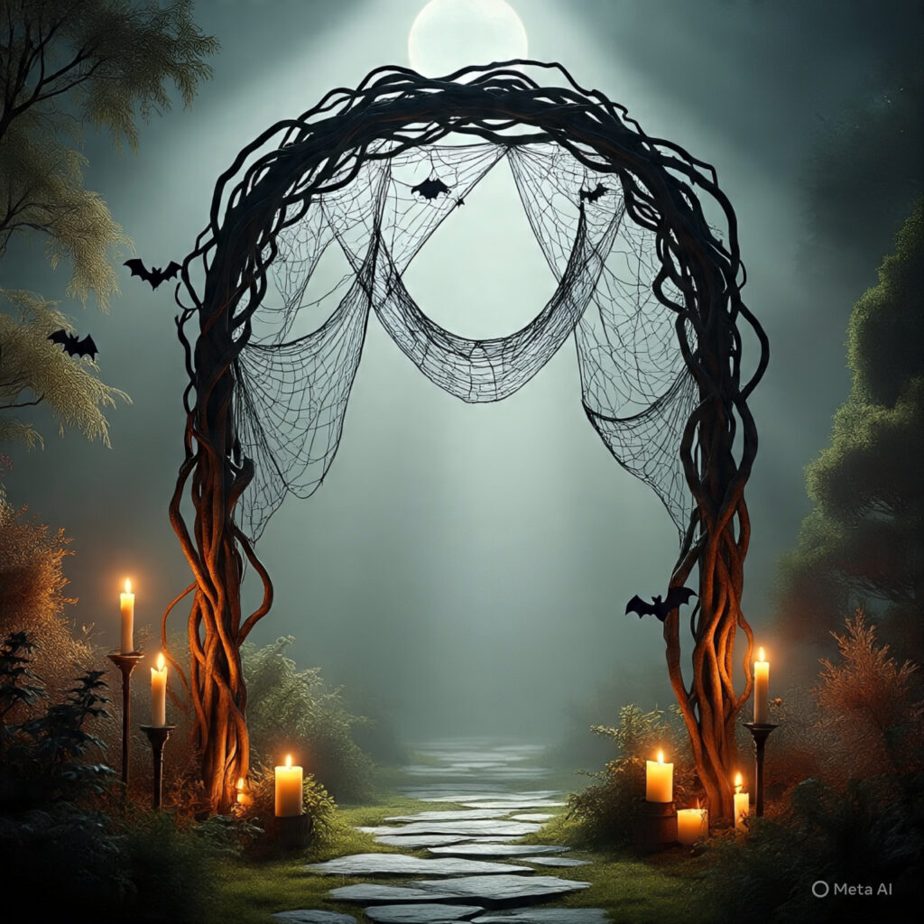 Frame your entryway with a spooky arch made from twigs, faux cobwebs, and hanging bats. Bonus points if you install motion-sensor sound effects like ghostly whispers!