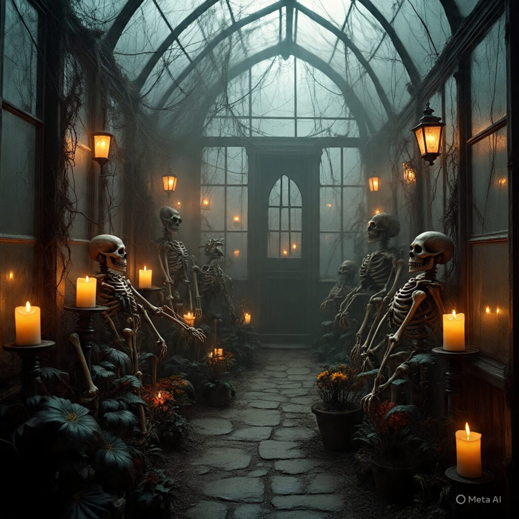 If you have a greenhouse, turn it into a spooky haunted house with dim lighting, cobwebs, and skeletons peeking through the glass.