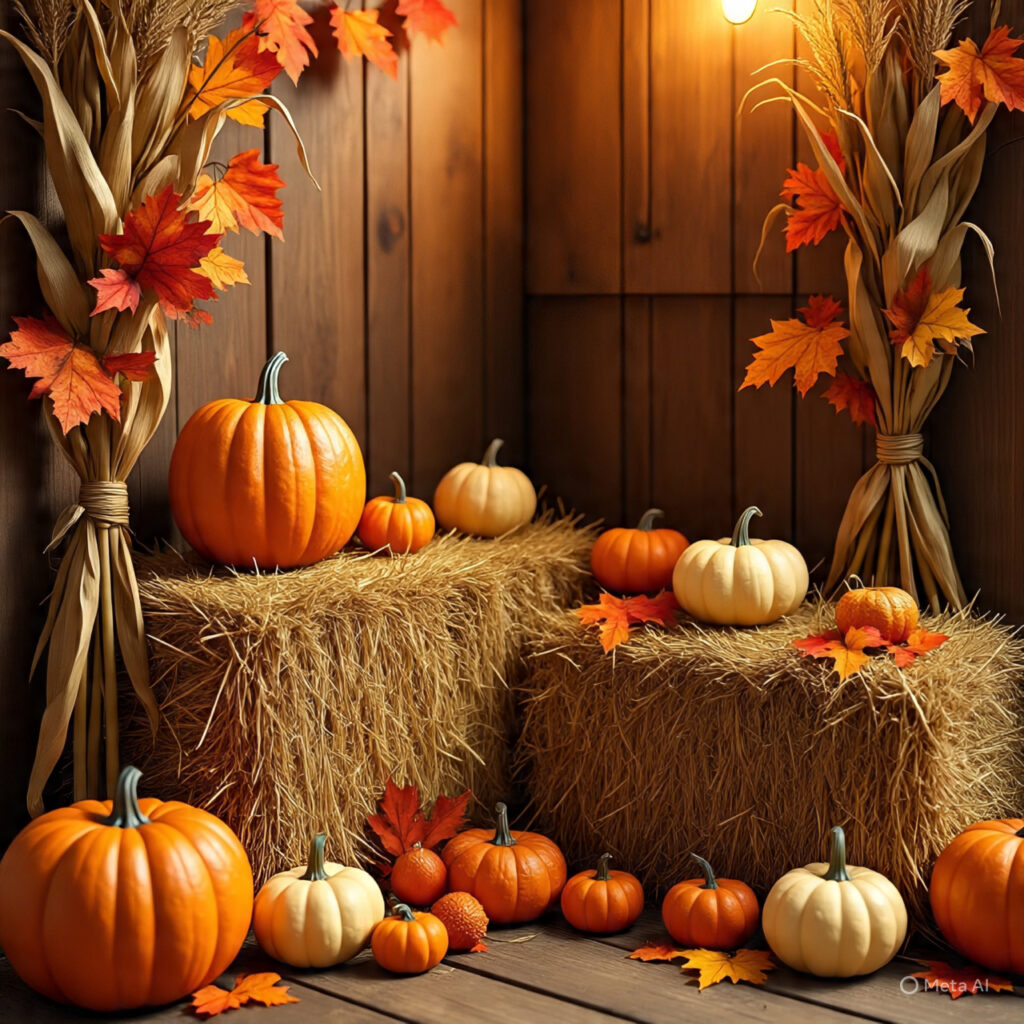 Create a small pumpkin patch corner with hay bales, corn stalks, and gourds. This idea blends festive charm with rustic Halloween spirit.