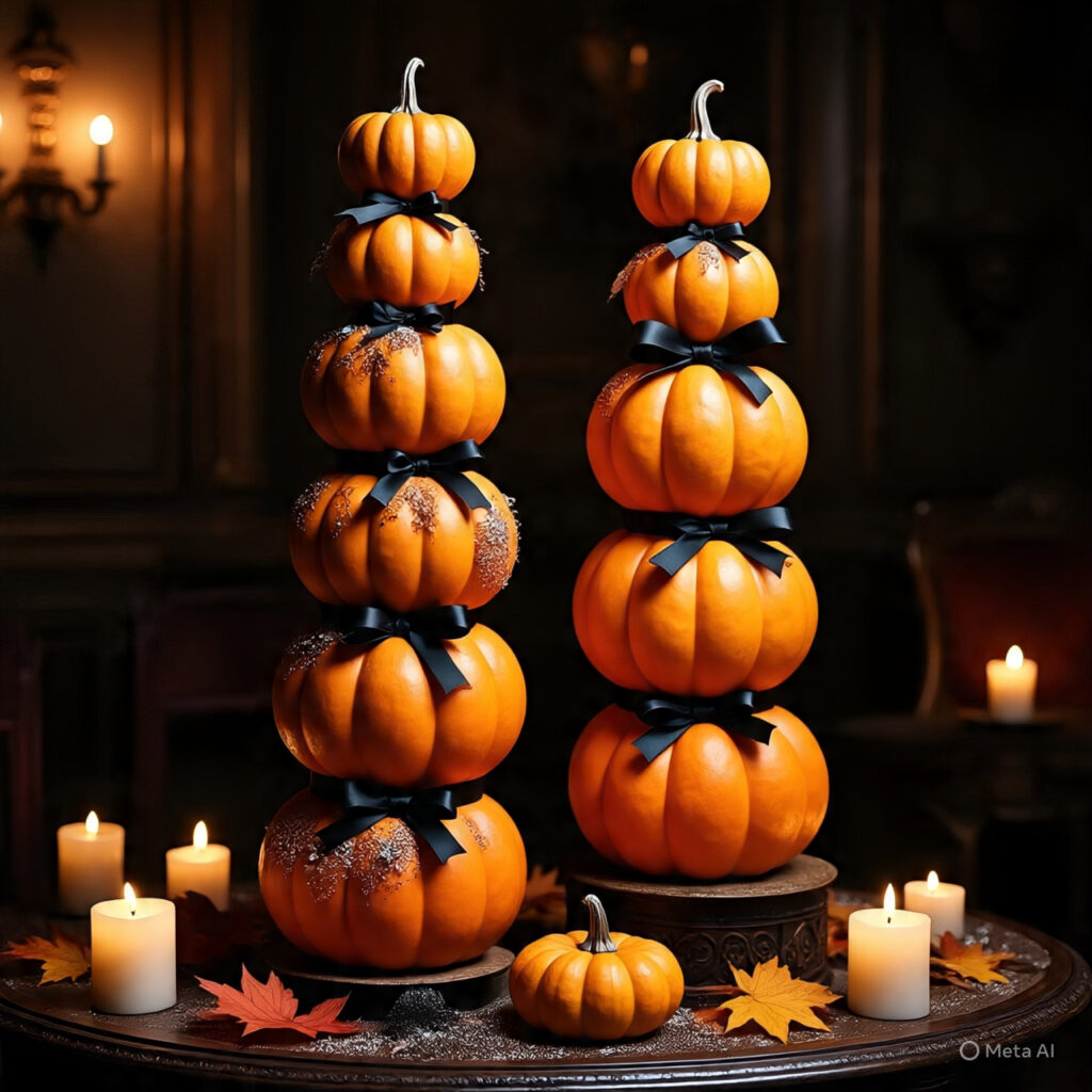 Stack real or faux pumpkins in a tower formation, decorating them with black ribbons, glitter, and autumn leaves for a chic yet eerie centerpiece.